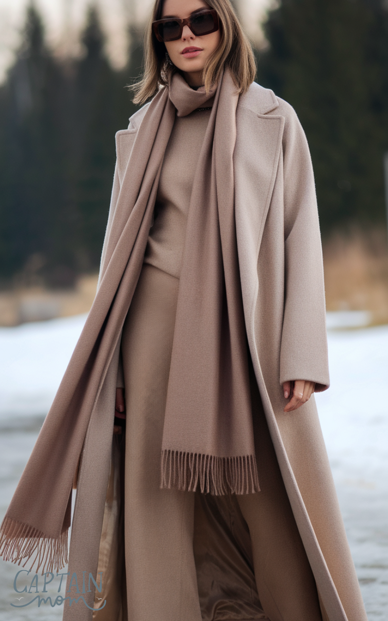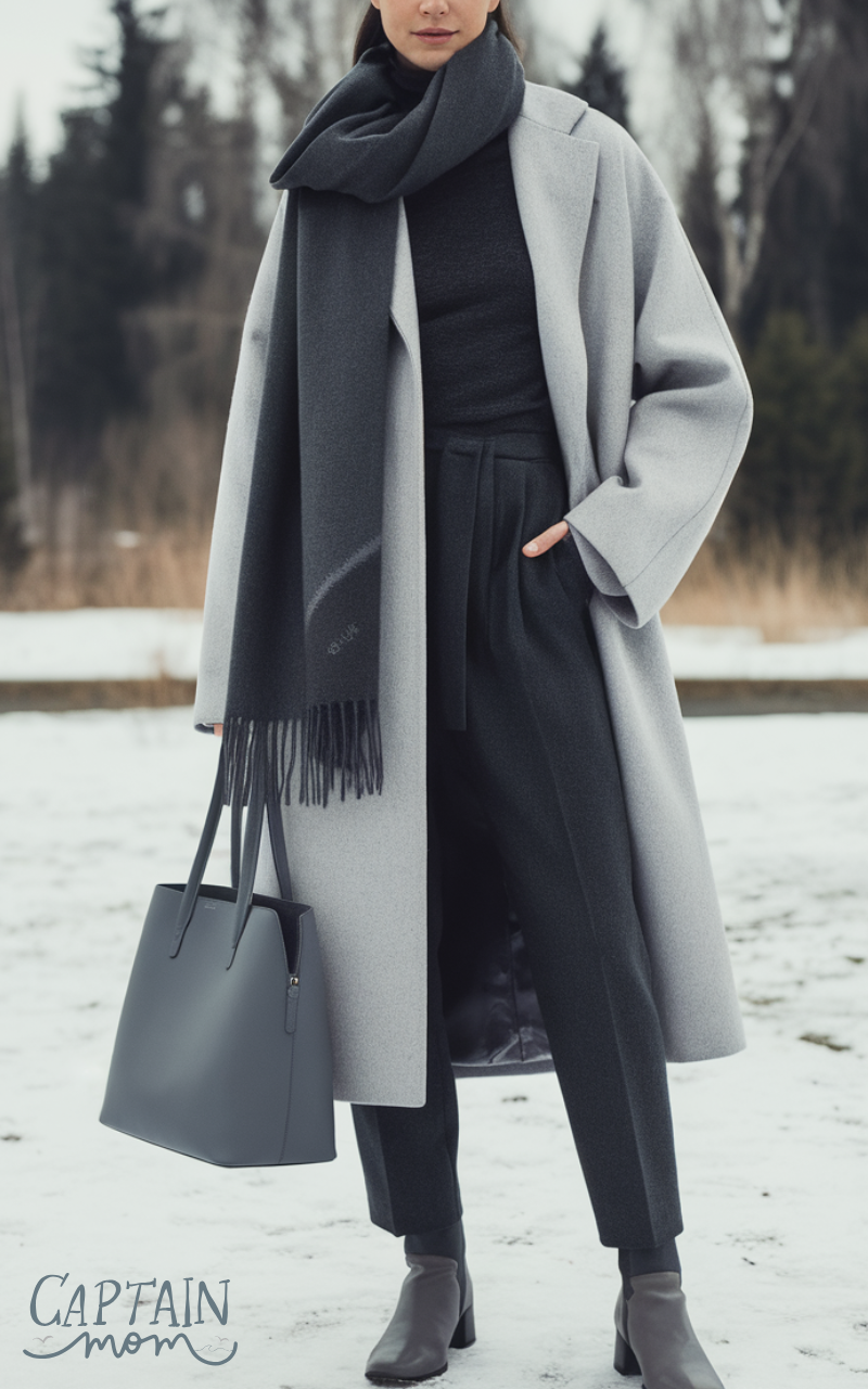 A long, neutral-toned coat paired with a matching scarf and ankle boots is the ultimate minimalist winter outfit for women. The focus is on simplicity, fit, and quality materials. This timeless look is versatile, warm, and elegant, embodying the clean lines and effortless style of minimalist winter fashion.