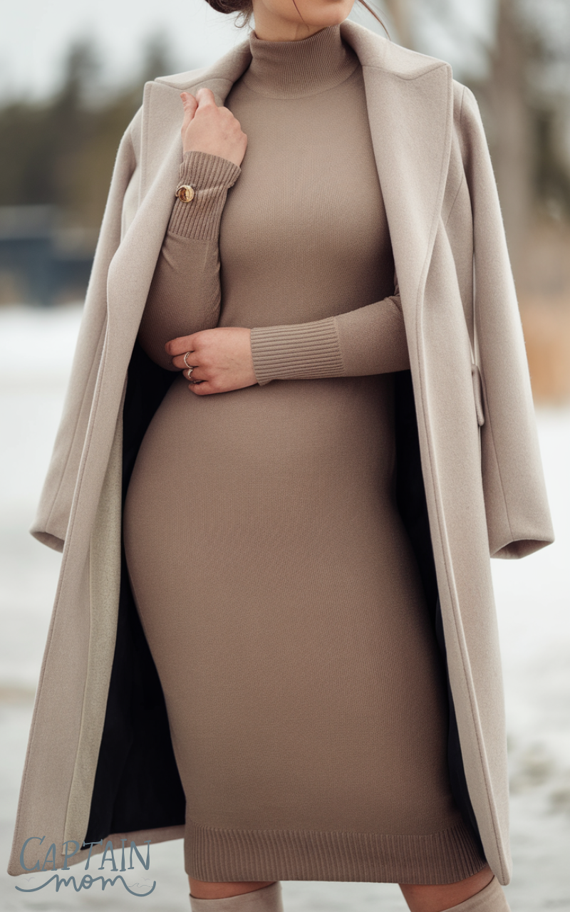 A midi sweater dress in neutral tones, like grey or taupe creates a simple minimalist winter outfit for women. Pair with knee-high boots and a structured coat. This look is effortless, polished, and warm, offering a balance between comfort and elegance with minimal accessories.