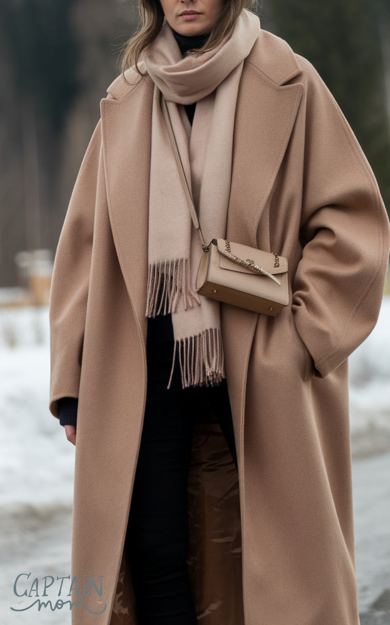 Pair an oversized camel coat with slim black pants for a minimalist winter outfit for women that balances volume and structure. Add ankle boots and a small crossbody bag. The oversized coat is comfortable and stylish, while the slim pants maintain the outfit’s clean lines, making it perfect for a modern winter wardrobe.