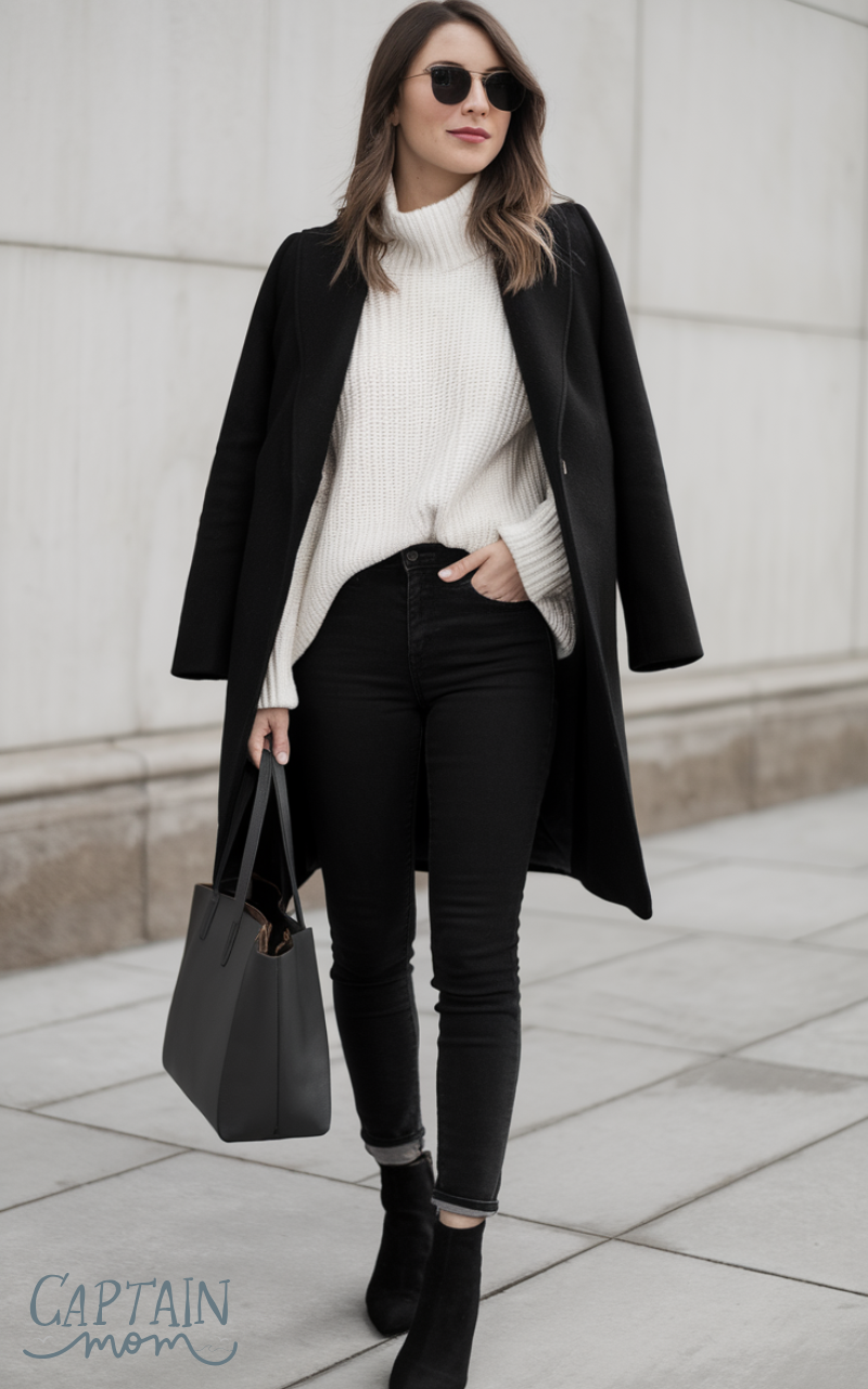 Combine a black wool coat, white knit sweater, and black skinny jeans for a crisp minimalist winter outfit for women. Finish with black ankle boots and a structured tote. This look is timeless, clean, and versatile, suitable for city walks or coffee dates. The contrast between black and white gives a sharp, modern feel without extra accessories.
