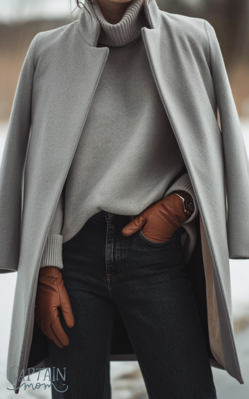 Layer a structured coat over a simple knit sweater and straight jeans for a polished minimalist winter outfit for women. Neutral tones and clean lines make the look effortlessly stylish. Minimal accessories like leather gloves or a watch keep the focus on the sharp silhouette.