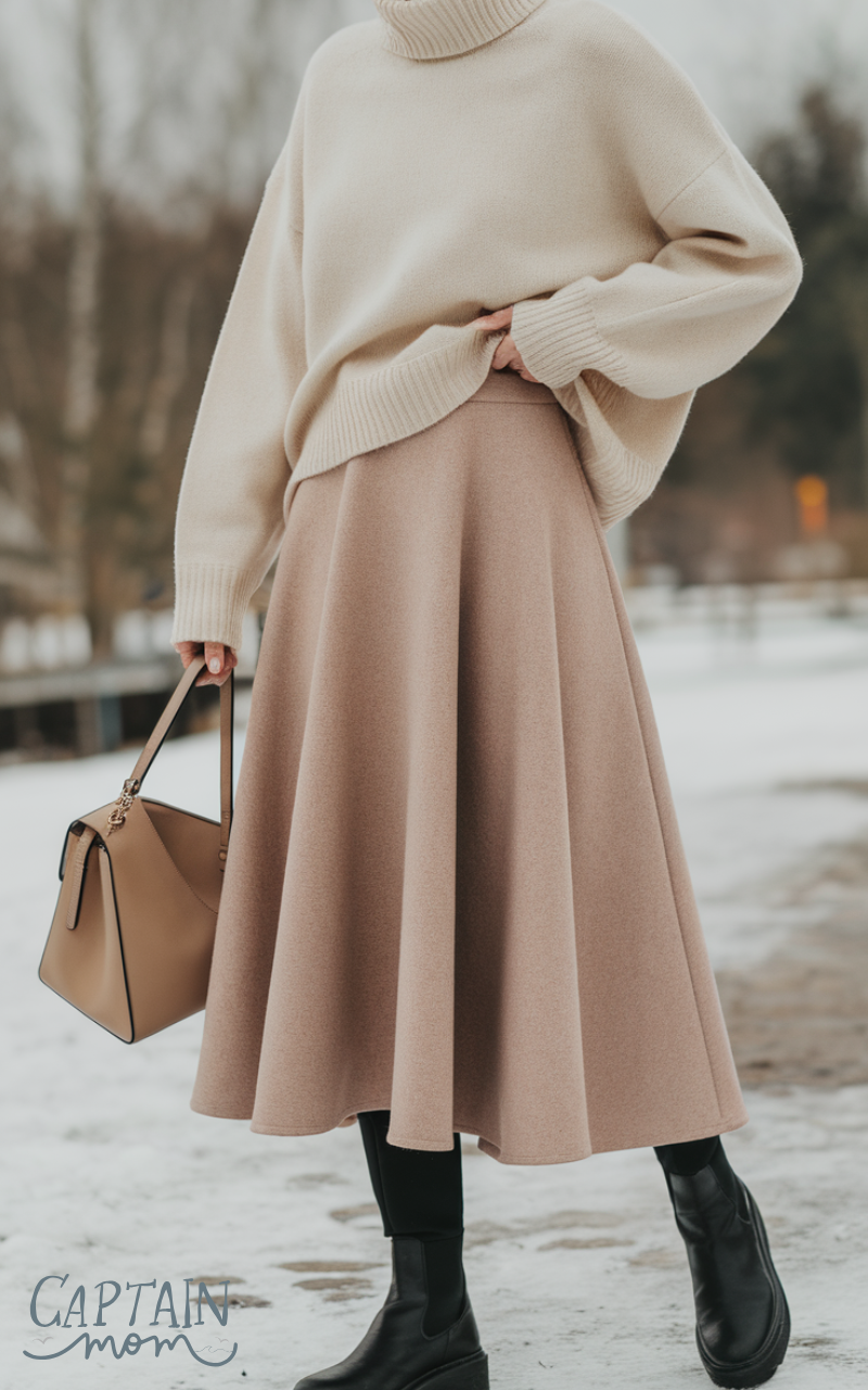 Combine a cream or beige sweater with a wool midi skirt for a feminine minimalist winter outfit for women. Pair with boots and a simple bag. This outfit creates soft, flowing lines that are clean and elegant, perfect for both work and casual settings.