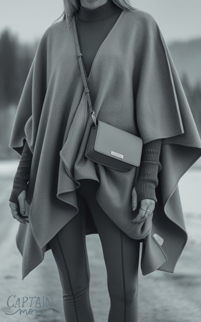 A wool poncho over a fitted top and leggings makes a minimalist winter outfit for women that’s relaxed yet chic. Add ankle boots and a crossbody bag. This combination balances comfort and style, creating a cozy, clean silhouette for cold-weather days.