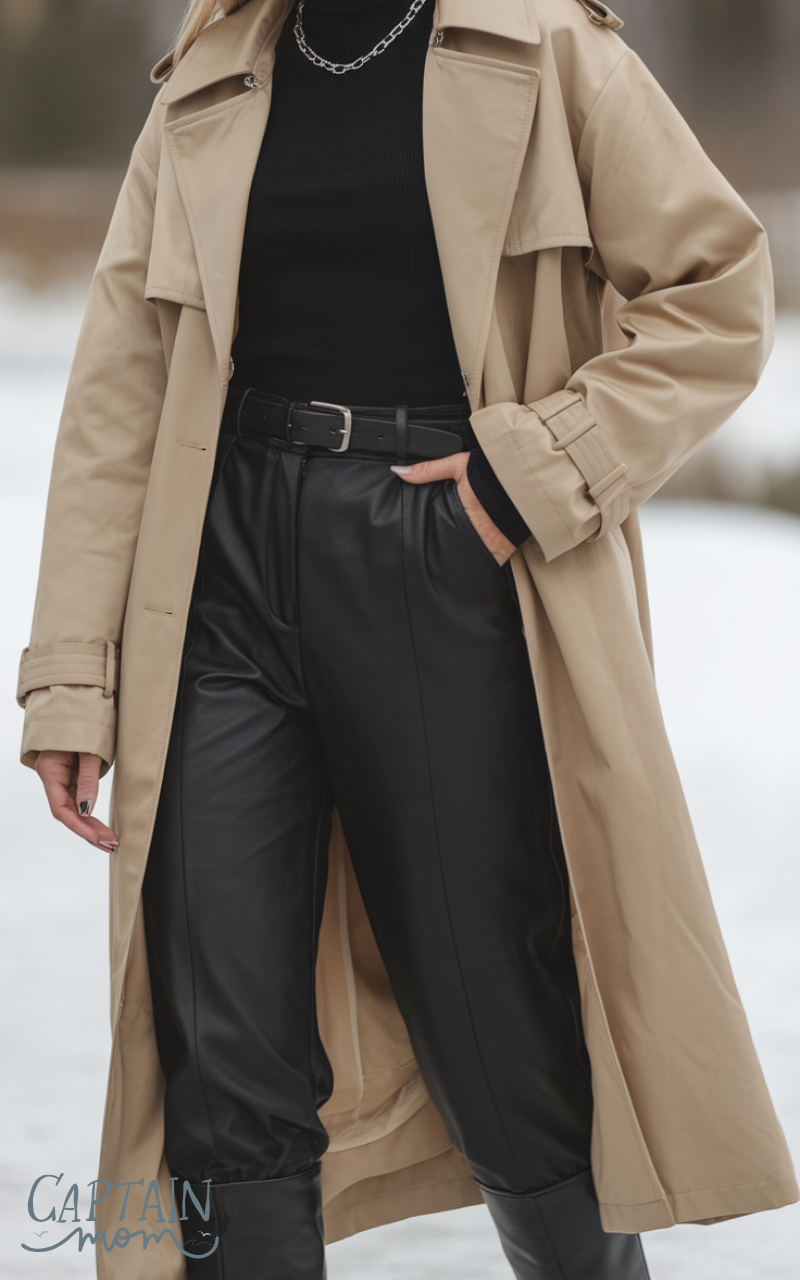 Layer a beige or camel trench coat over all-black attire for a clean, minimalist winter outfit for women. The coat acts as a statement piece without overwhelming the look. Finish with black leather boots and minimal jewelry for a sleek, effortless winter style.