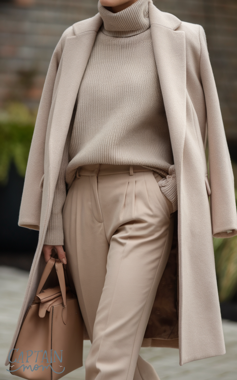 A beige turtleneck sweater paired with tailored beige trousers and neutral boots creates a minimalist winter outfit for women that’s both sophisticated and understated. Adding a matching coat elevates the look without complicating it. Accessories are minimal: a simple leather bag and stud earrings. This monochrome palette highlights clean lines and ensures a polished appearance ideal for work or casual outings.