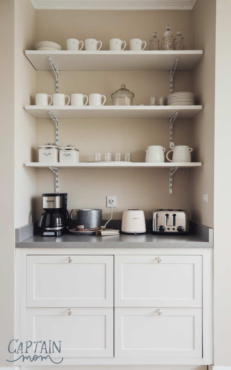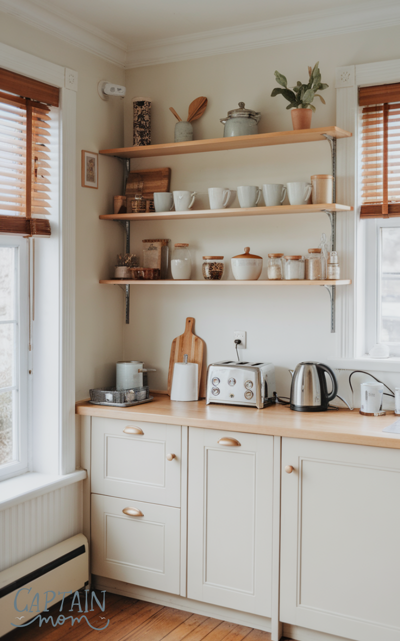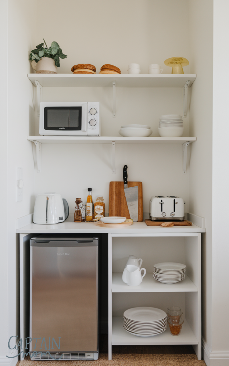 Floating shelves create a sleek Breakfast Station Small Kitchen look without bulky furniture. They provide just enough space for mugs, jars, and small appliances. This setup keeps the kitchen open and modern while remaining functional. Floating shelves are affordable and easy to install, making them ideal for small kitchens.