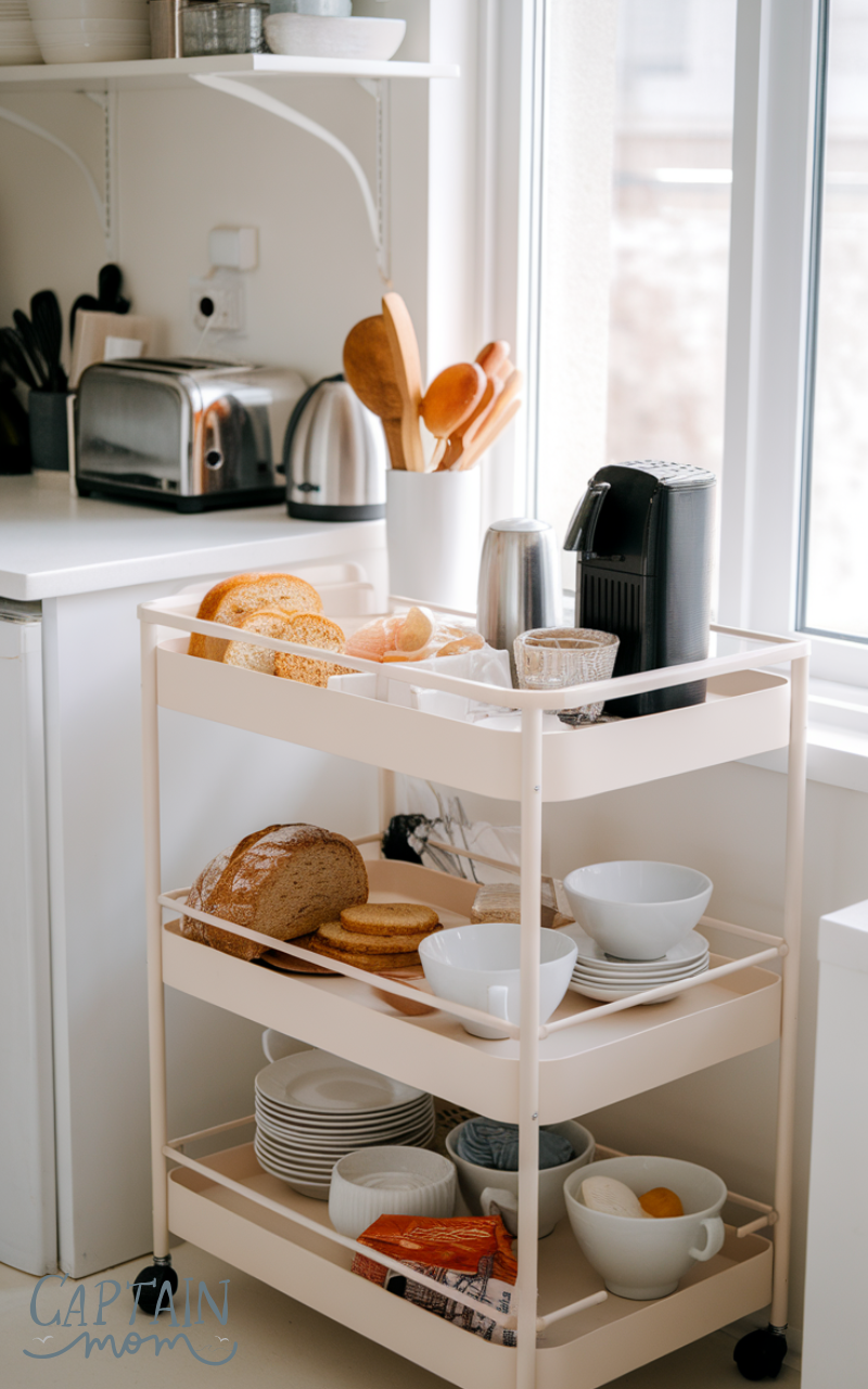 A rolling cart is a flexible Breakfast Station Small Kitchen idea that adds storage without permanent installation. You can place coffee supplies, bread, and breakfast bowls on different levels and move the cart as needed. This option is ideal for renters or very small kitchens. When not in use, the cart can be rolled away, keeping your kitchen open and uncluttered.