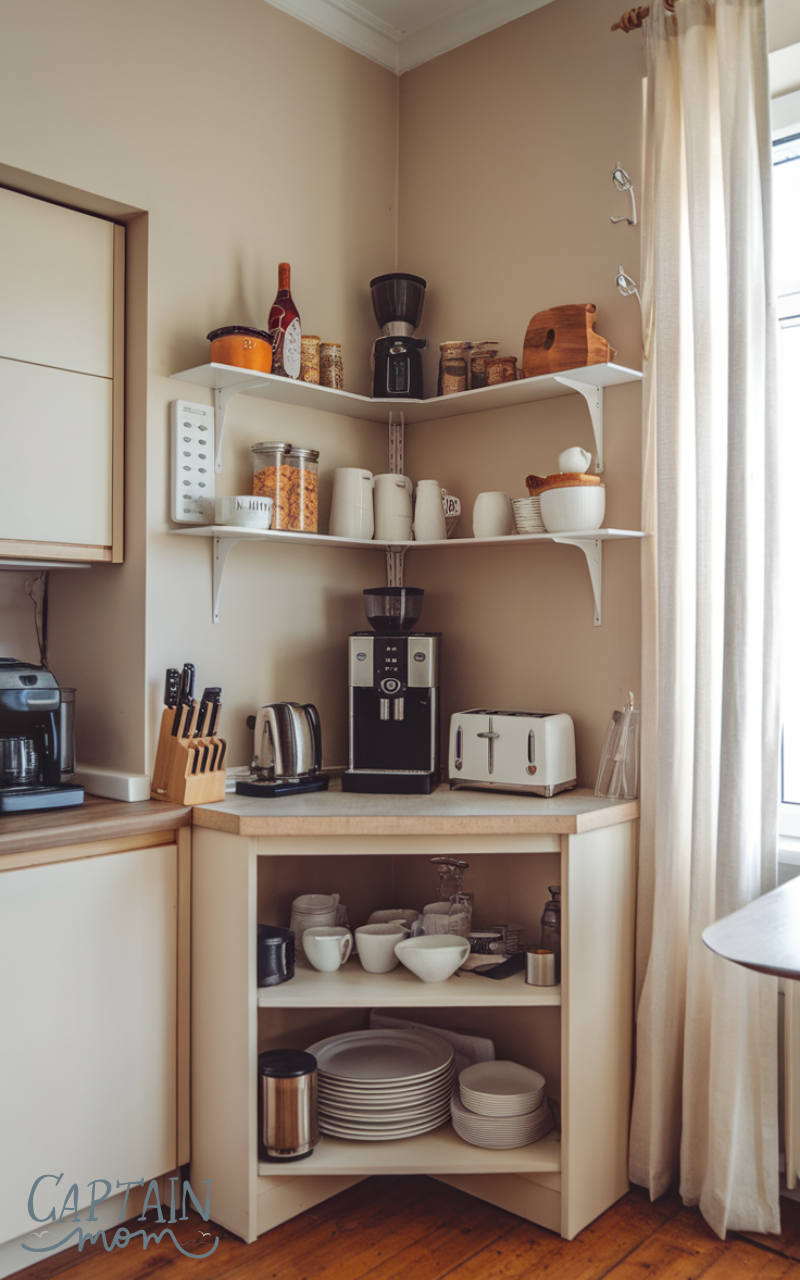 Using a corner is a smart Breakfast Station Small Kitchen solution that often goes overlooked. A small corner counter or shelf can hold a coffee machine, toaster, and jars without interfering with main cooking areas. Corner stations create a cozy and efficient breakfast zone while maximizing unused space. This idea works well in compact kitchens where every inch matters.
