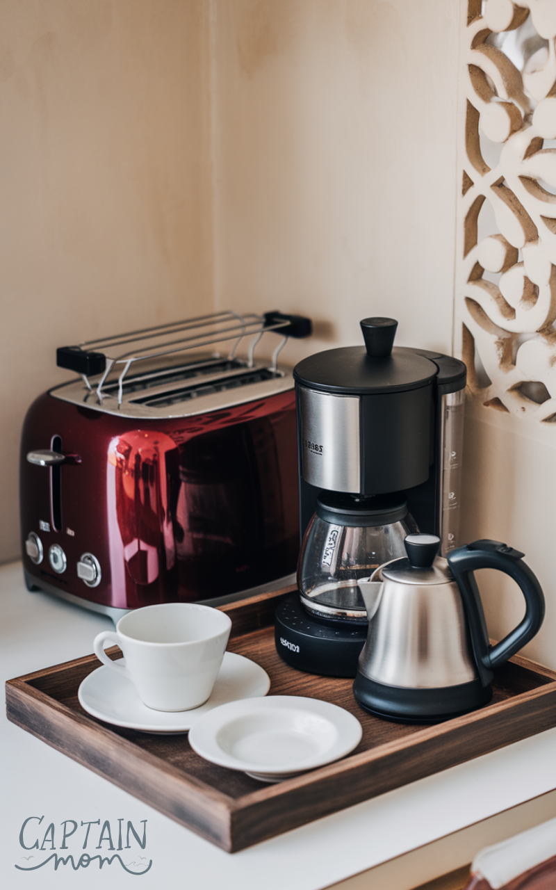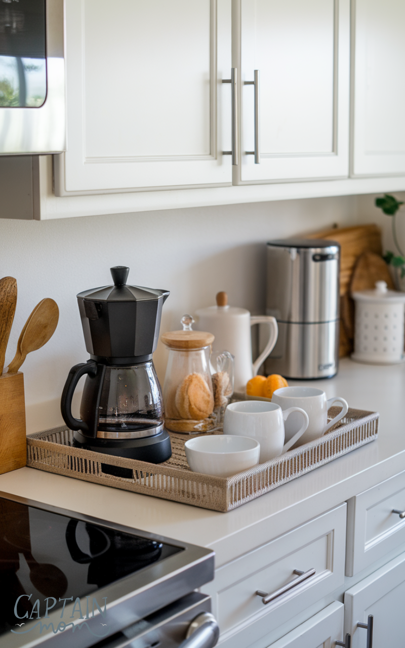 Using a dedicated tray is a simple Breakfast Station Small Kitchen idea that keeps everything organized in one spot. A tray can hold a coffee maker, mugs, sugar, and small breakfast items while visually separating the station from the rest of the counter. This setup reduces clutter and makes cleaning easier. Trays also add a decorative touch, helping your small kitchen look intentional and well-arranged while keeping breakfast essentials within easy reach every morning.