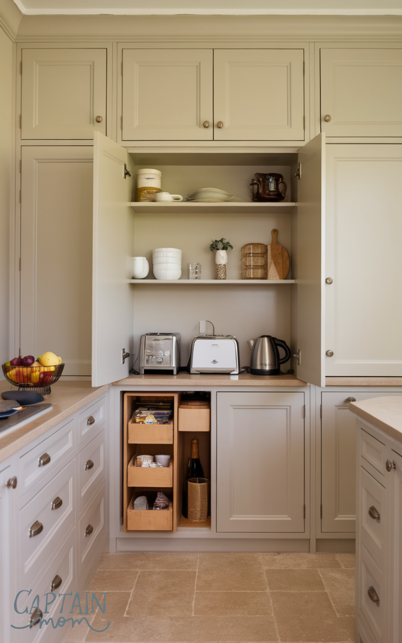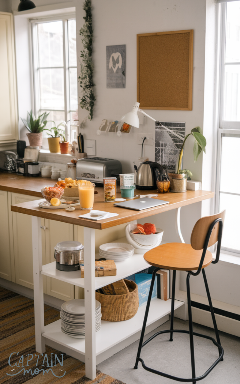 Using a pantry for a Breakfast Station Small Kitchen keeps counters free and hides appliances when not in use. Shelves can store cereal, coffee, and breakfast tools neatly in one place. This setup improves organization and keeps your kitchen visually clean. It’s especially useful in small kitchens that need clear surfaces for cooking.