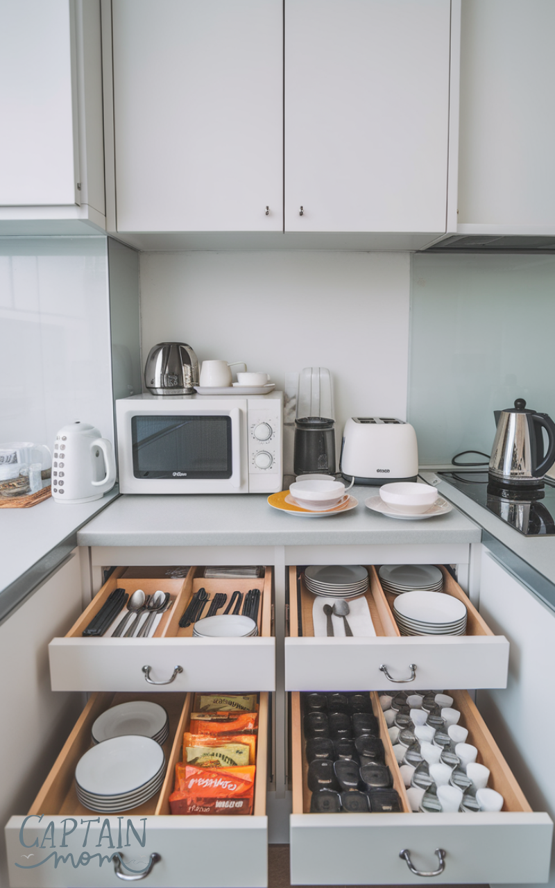 Using drawers for breakfast storage is a clever Breakfast Station Small Kitchen idea. Drawers can hold utensils, napkins, tea bags, and coffee pods, keeping counters clear. This design improves organization and makes mornings faster. It’s a subtle yet effective way to create a breakfast station without adding visual clutter.