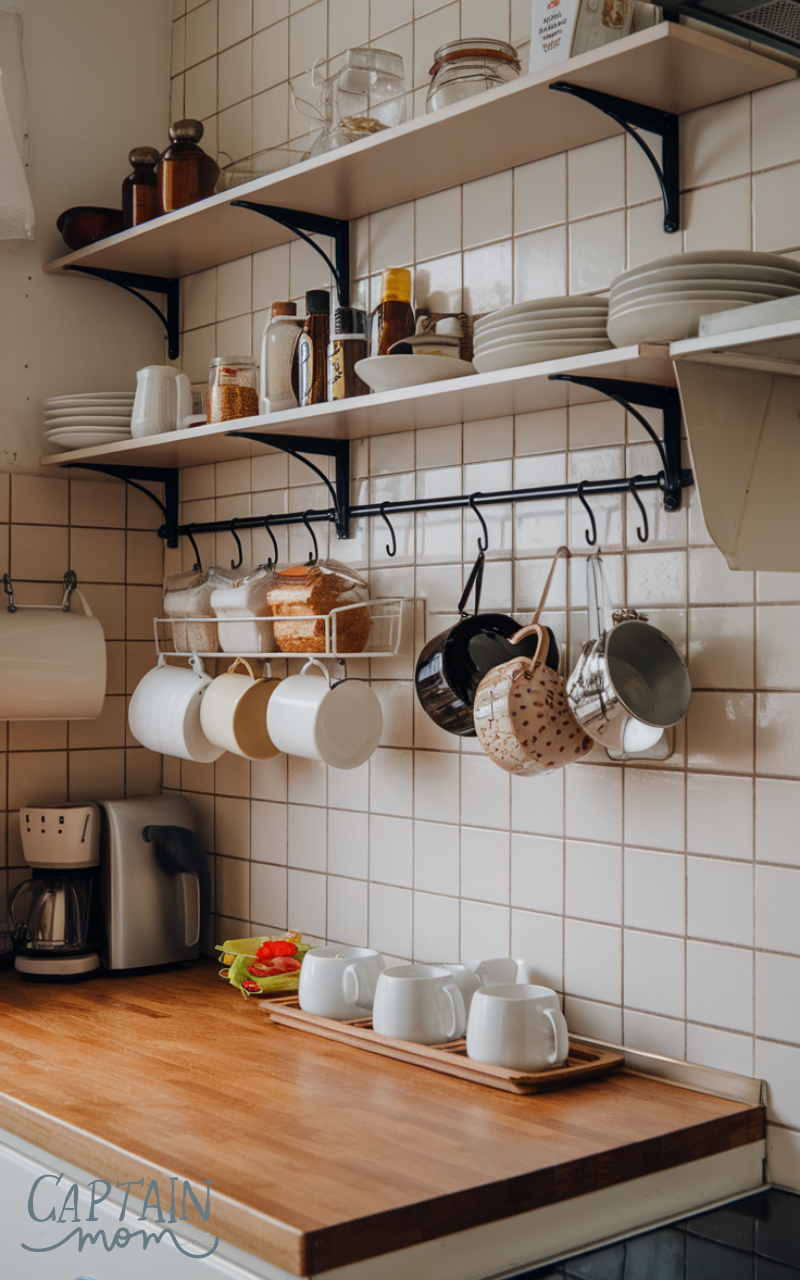Wall-mounted shelves are excellent for a Breakfast Station Small Kitchen because they use vertical space instead of valuable counter area. You can store cereal jars, coffee cups, and small appliances neatly above your counter. This setup keeps surfaces clear while making the station visually appealing. Open shelves also make breakfast items easy to grab, improving morning flow without overcrowding your small kitchen layout.