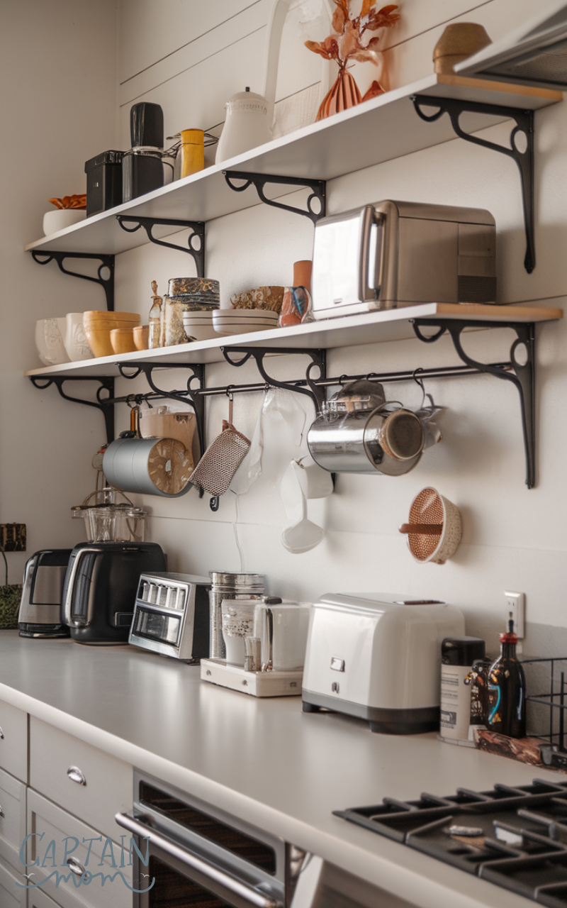 Installing wall-mounted shelves enhances Kitchen Counter Organization with Small Appliances by lifting items off the counter. Small appliances used occasionally can be stored above while keeping countertops clear. This creates visual openness and improves workflow. Wall shelves also allow decorative styling, blending organization with design while maintaining easy access when needed.