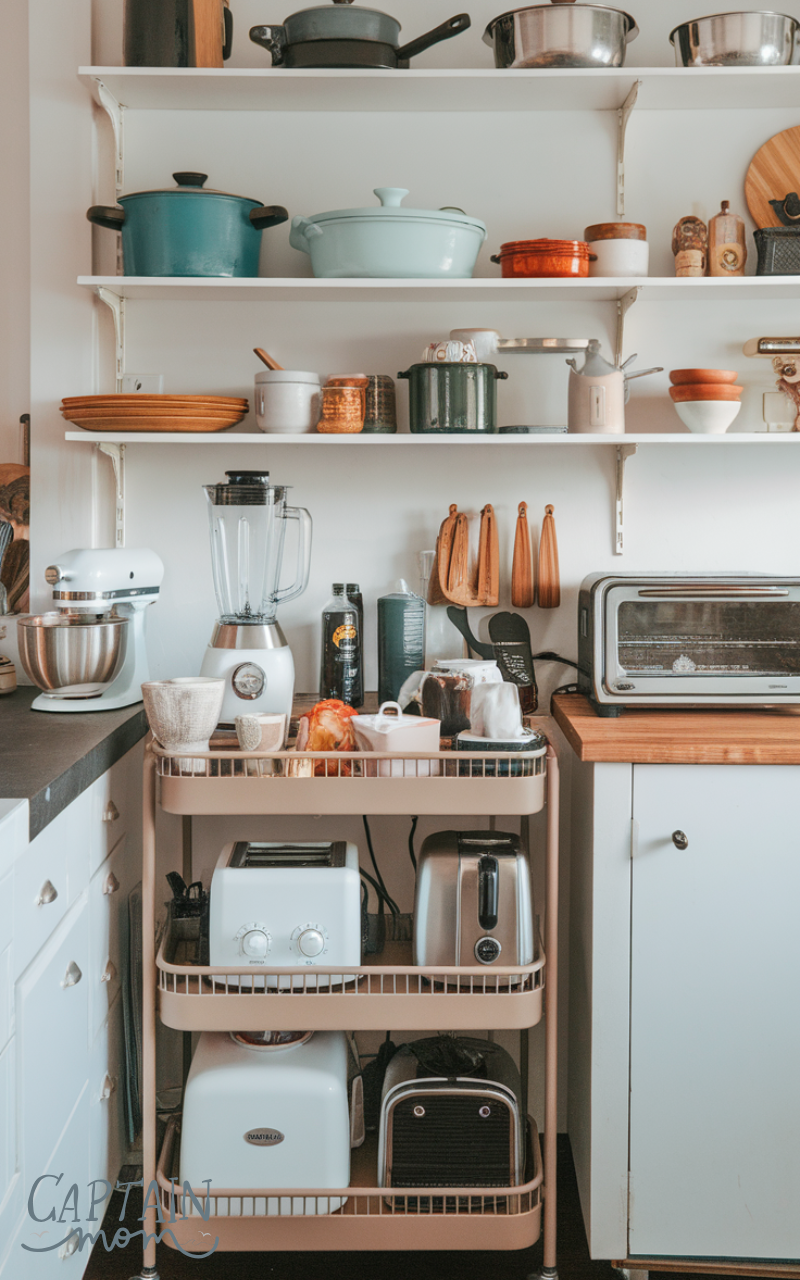 Rolling carts are flexible Kitchen Counter Organization with Small Appliances options. They provide extra surface and storage for appliances that don’t need to stay out all the time. You can move the cart when cooking and store it away afterward. This method reduces counter congestion and adds versatility. Rolling carts are especially useful in small kitchens or apartments where counter space is limited.