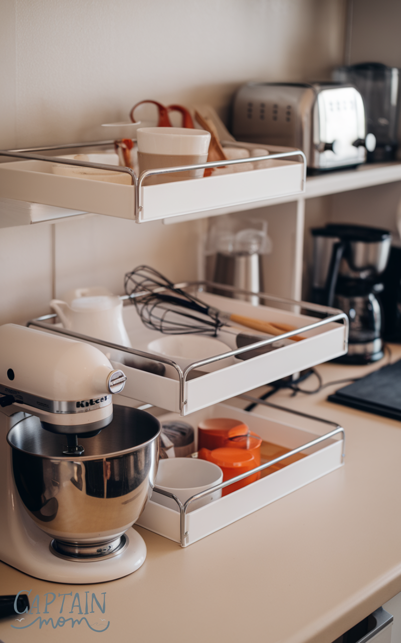 Tiered shelves are effective for Kitchen Counter Organization with Small Appliances because they utilize vertical space. Placing smaller appliances like mixers or kettles on lower tiers and accessories above keeps the counter organized. This solution improves accessibility and prevents overlapping clutter. Tiered shelves are budget-friendly and stylish, making them perfect for compact kitchens that need more storage without renovations.