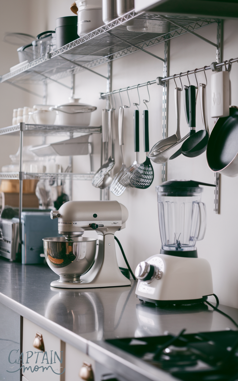 Vertical racks are smart Kitchen Counter Organization with Small Appliances solutions for accessories and attachments. Storing mixer tools or blender cups vertically frees counter space. This prevents overcrowding and improves visual order. Vertical storage enhances functionality while maintaining a clean and structured countertop.