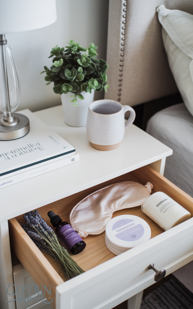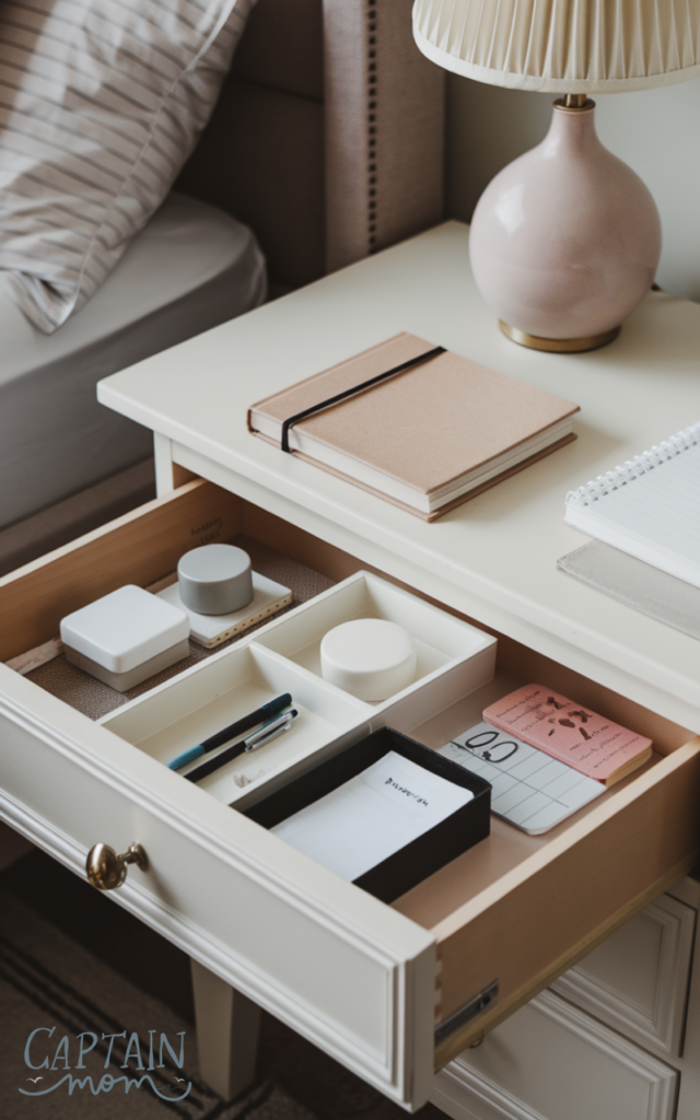 Transform your space with a self-care focused Bedroom Nightstand Drawer Organization approach. Include calming items like lavender oil, a sleep mask, or soothing hand cream. Group them neatly in one section to create a relaxing nighttime ritual area. This intentional setup supports mental wellness and keeps your drawer purposeful rather than random.