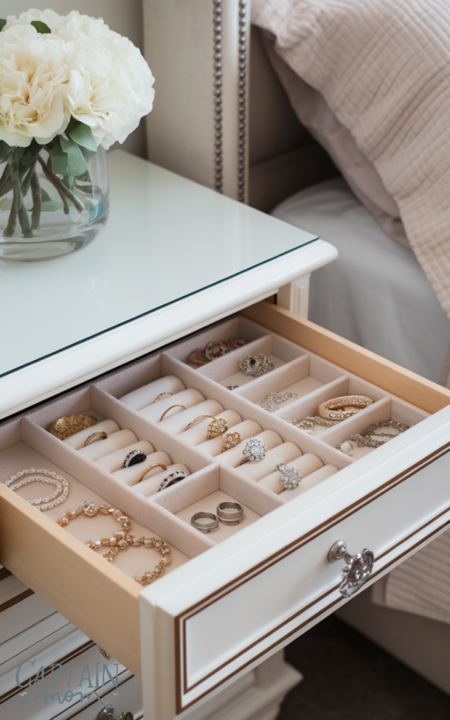 Using a jewelry insert enhances Bedroom Nightstand Drawer Organization by protecting delicate pieces. Rings, earrings, and bracelets stay separated and untangled. Instead of tossing jewelry loosely into the drawer, an insert keeps items secure and easy to select. This reduces damage and saves time during busy mornings. A small structured jewelry space adds elegance and functionality to your bedside storage.