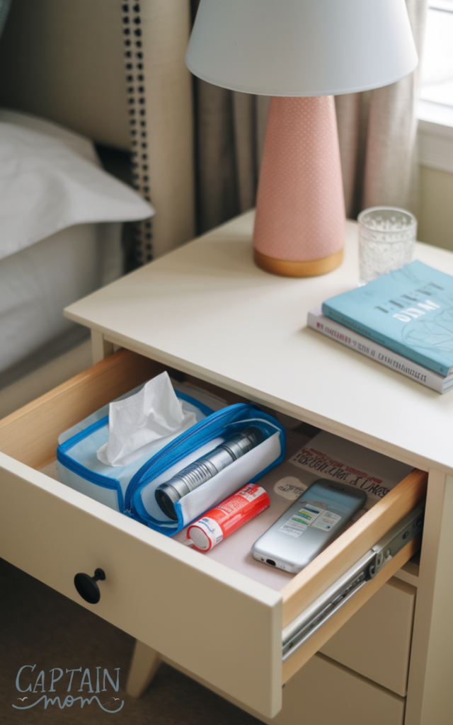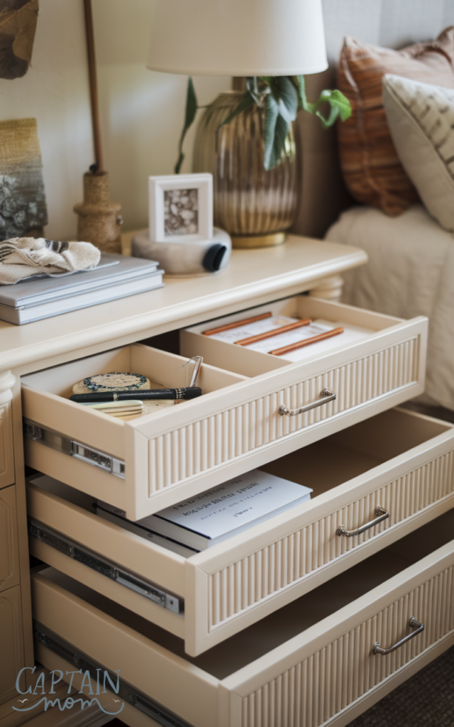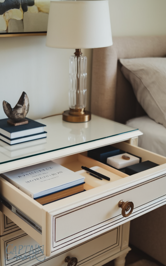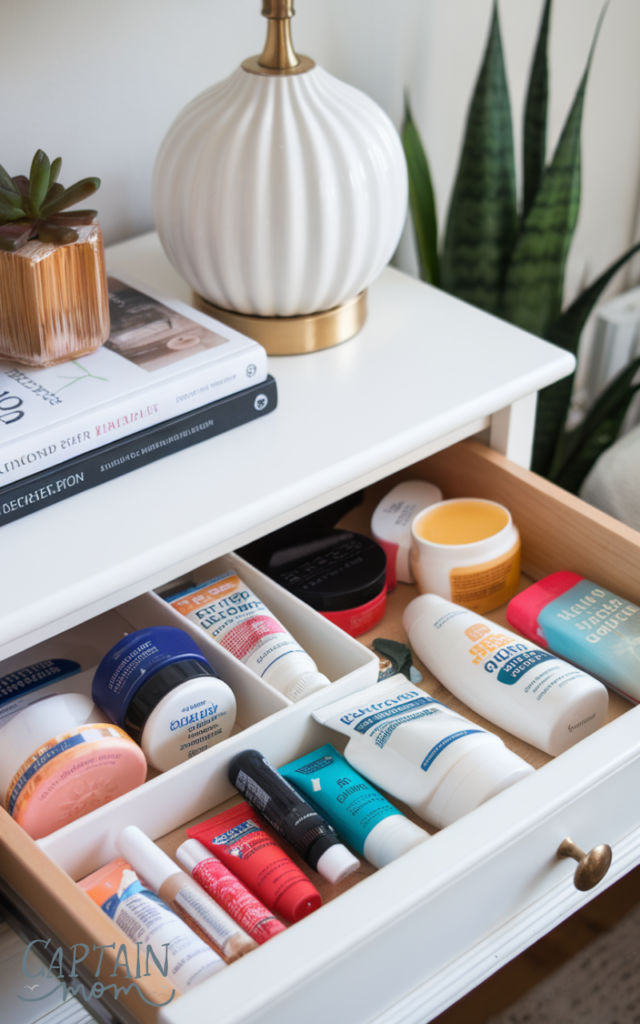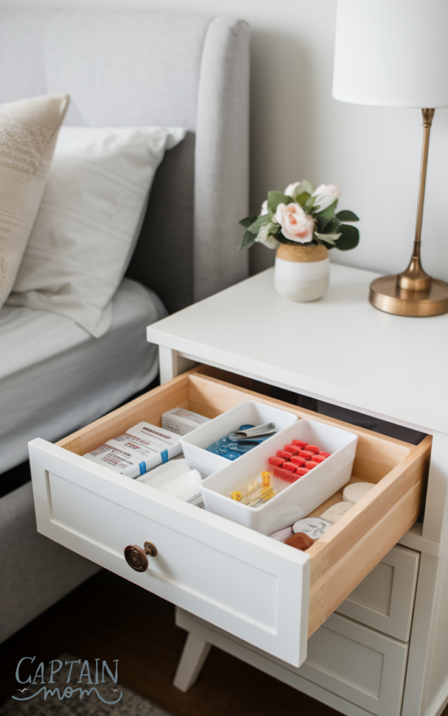 A small health section improves Bedroom Nightstand Drawer Organization and ensures safety. Store medications, vitamins, or allergy tablets in a secure container inside the drawer. Keep them clearly separated from other items to avoid confusion. This system makes nighttime or early morning access simple and organized. Having a designated health corner provides peace of mind and prevents clutter from mixing with important essentials.