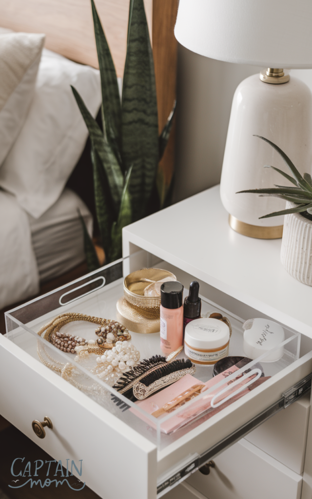 Clear acrylic trays are perfect for Bedroom Nightstand Drawer Organization because they allow you to see everything at a glance. Visibility reduces the need to dig through items, which keeps the drawer tidy longer. These trays work well for jewelry, hair accessories, or small skincare products. Transparent organizers create a modern and neat look while improving functionality. When items are visible, they are easier to manage and maintain daily.