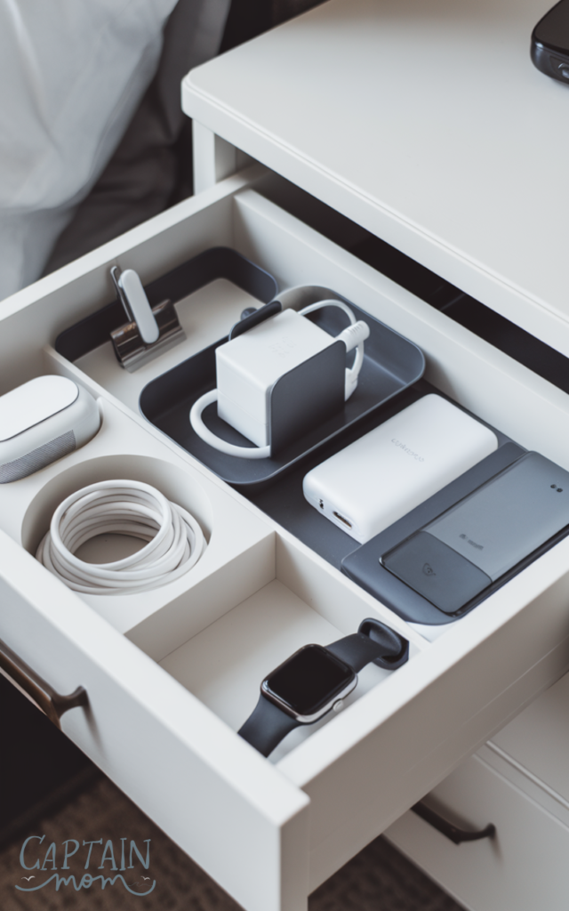 Cords can easily create chaos, so dedicating a section for electronics improves Bedroom Nightstand Drawer Organization instantly. Use cable clips or small cord organizers to keep chargers untangled. Store earbuds, power banks, or smart watches in a specific compartment. This prevents wires from mixing with personal items and keeps everything accessible. An organized charging area protects your devices and maintains a clean, streamlined drawer appearance.
