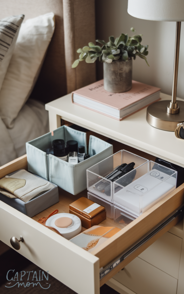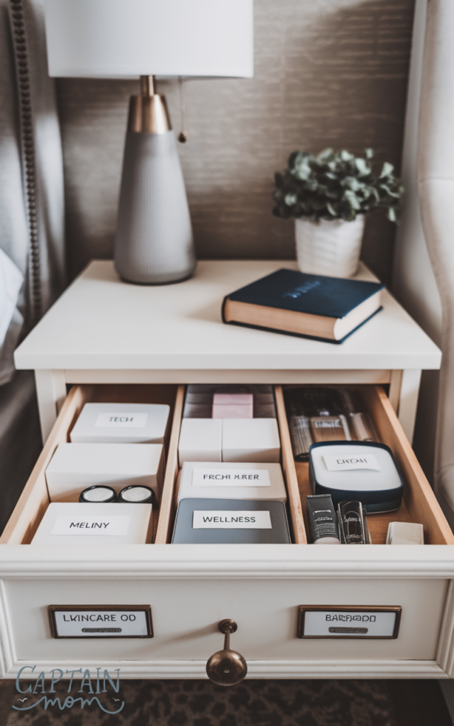 Labeling containers enhances Bedroom Nightstand Drawer Organization by making categories clear. Even inside a private drawer, labels prevent confusion and keep family members organized. Small discreet labels on boxes for skincare, tech, or wellness items make tidying faster. This system creates structure and accountability, ensuring items return to their correct place every time.