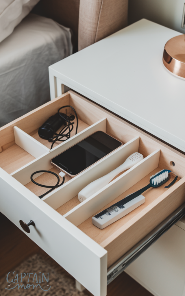 Adjustable dividers are a smart Bedroom Nightstand Drawer Organization solution because they create custom compartments. You can separate electronics, personal care, and small accessories neatly without items sliding around. Dividers maximize space and prevent messy piles from forming. They are especially helpful for deep drawers where objects easily stack on top of each other. With everything in its own section, your drawer feels structured and tidy, and finding what you need becomes quick and stress free, even in the dark.