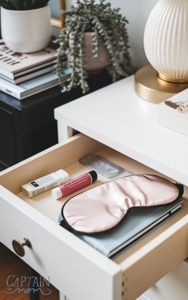 A night routine kit is a practical Bedroom Nightstand Drawer Organization idea that keeps bedtime smooth. Gather your sleep essentials such as magnesium spray, lip balm, hand cream, and a silk eye mask into one compact container. Having everything in one place supports consistency and relaxation. This method reduces searching and encourages healthy habits. It turns your drawer into a wellness station that promotes calm evenings and better sleep quality.