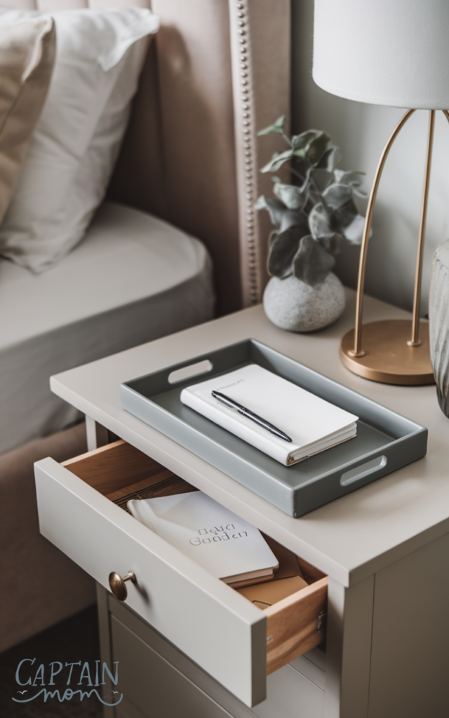 If you enjoy journaling, dedicate space for a small notebook and pen within your Bedroom Nightstand Drawer Organization system. Keeping writing tools neatly aligned encourages reflection and relaxation before sleep. Use a slim tray to prevent papers from bending. Organized journaling essentials promote mindfulness and keep your drawer looking clean and intentional.