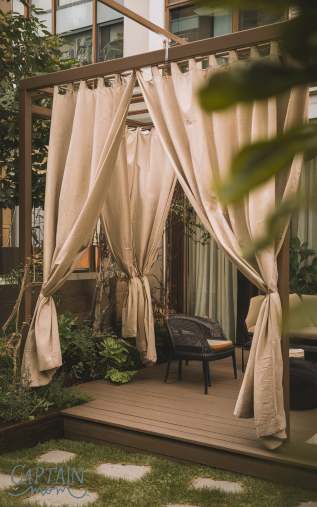 Outdoor curtains instantly elevate Renter Friendly Backyard Upgrades by adding softness and elegance. Hang them from tension rods or freestanding frames to avoid drilling. I love how they create shade and privacy while giving a resort-like feel. Light, flowing fabrics make the space look dreamy and inviting. They are removable, washable, and easy to pack when moving.