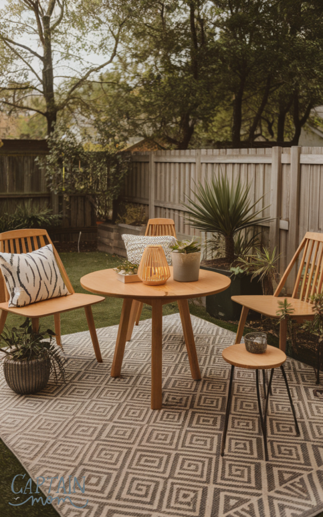 Adding an outdoor rug is one of the fastest Renter Friendly Backyard Upgrades you can make. It defines your seating area and makes the space feel like an outdoor living room. I suggest choosing weather-resistant materials that are easy to clean. Rugs add color, texture, and personality without changing the structure of the backyard. When it’s time to move, just roll it up and take it with you. It’s affordable, stylish, and completely damage free.