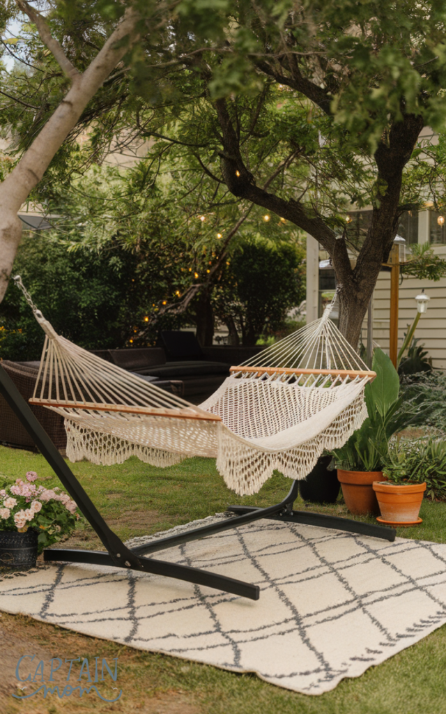 A hammock with a stand is one of the coziest Renter Friendly Backyard Upgrades. Since it includes its own frame, there’s no need to attach it to trees or walls. I love how it adds a relaxed vacation vibe instantly. It’s easy to assemble and disassemble, making it ideal for renters.