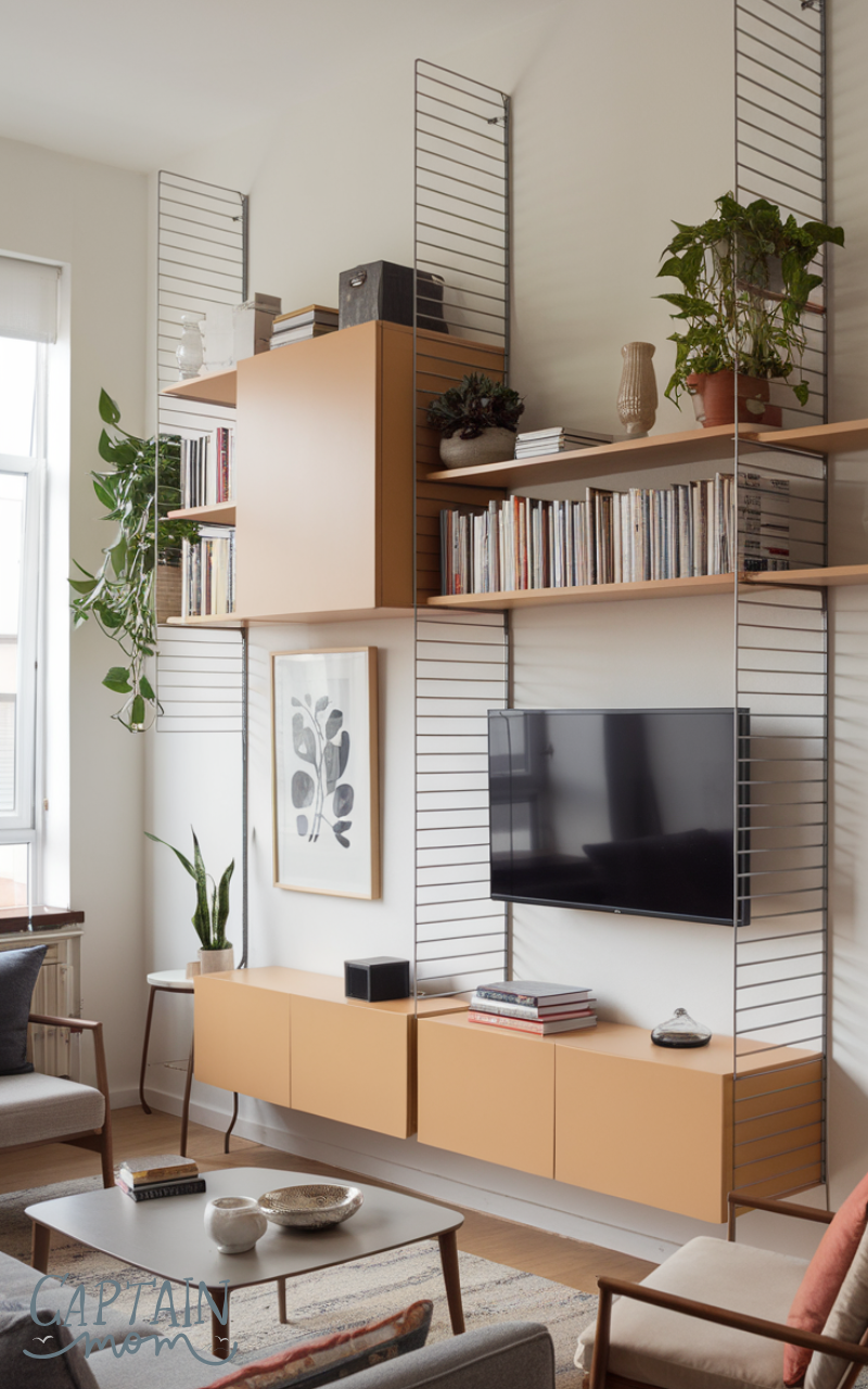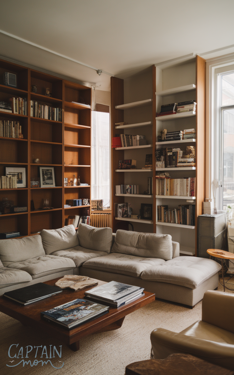 Vertical storage maximizes space in an apartment living room. Tall shelves or wall-mounted cabinets keep items organized while freeing up floor space. This approach keeps the room tidy and functional. Smart storage solutions are key to a well-organized apartment living room.