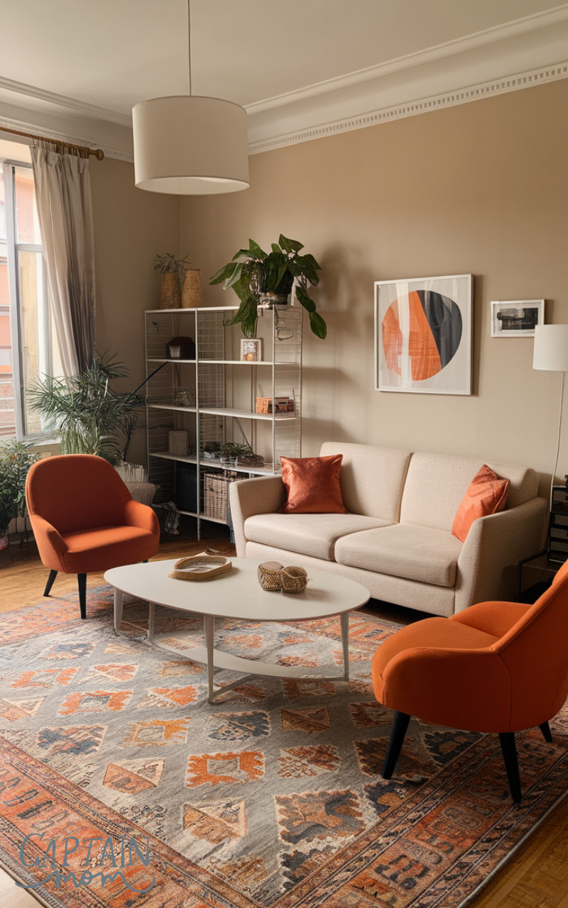A statement rug defines the seating area and adds warmth to an apartment living room. Rugs help visually separate spaces, especially in open-plan apartments. Choose patterns or textures that complement your furniture without overpowering the room. This simple addition instantly upgrades the apartment living room and makes it feel more complete.