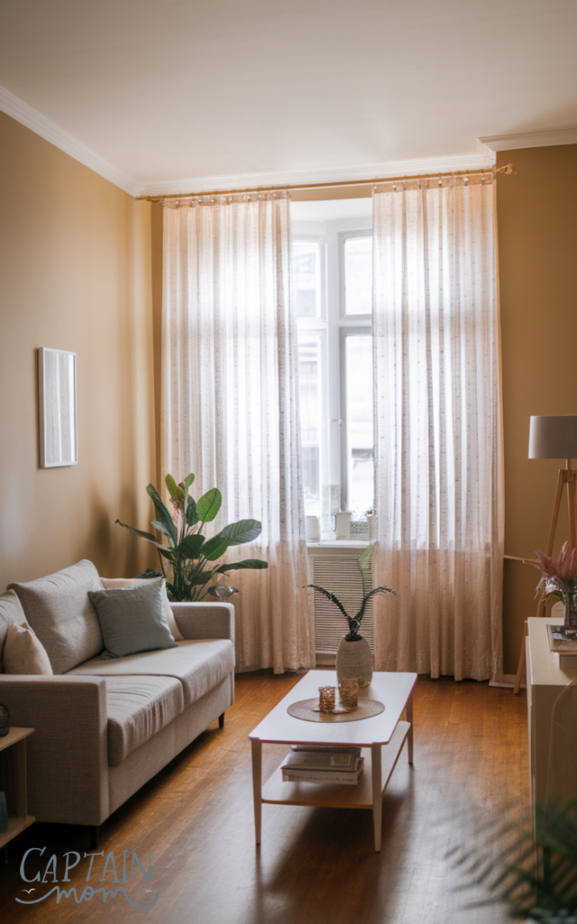 Sheer curtains allow natural light to flow into an apartment living room while maintaining privacy. Heavy curtains can make small spaces feel closed in. Light fabrics keep the room bright and open. This choice instantly refreshes the apartment living room.