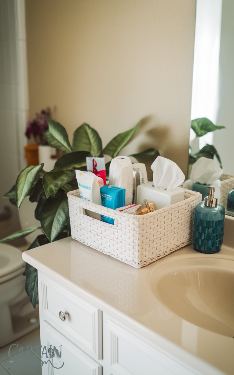 A small basket for toiletries, tissues, or personal items keeps the counter tidy. This guest bathroom essential adds organization and a welcoming touch, ensuring guests feel comfortable and at ease.