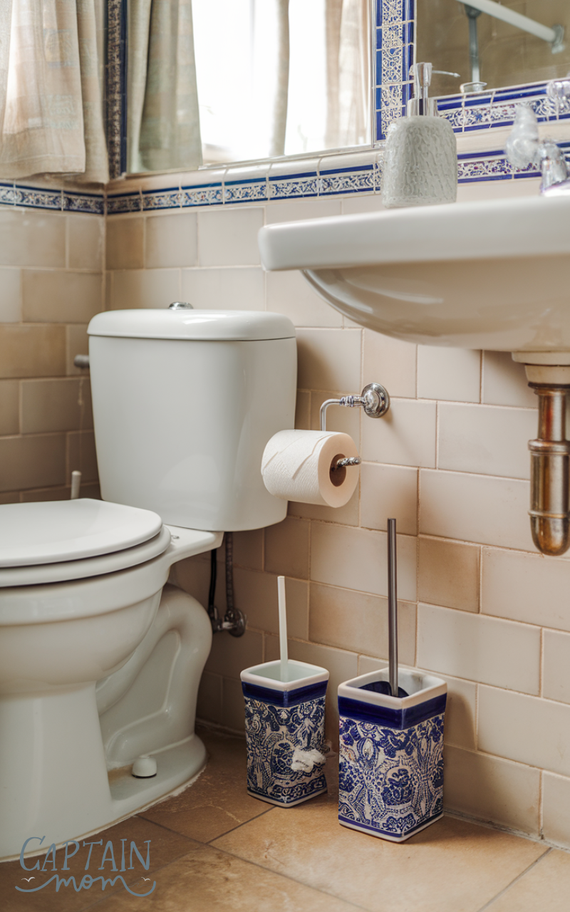 A discreet toilet brush keeps the bathroom clean. While guests shouldn’t need it, having one on hand shows attention to hygiene and practicality.