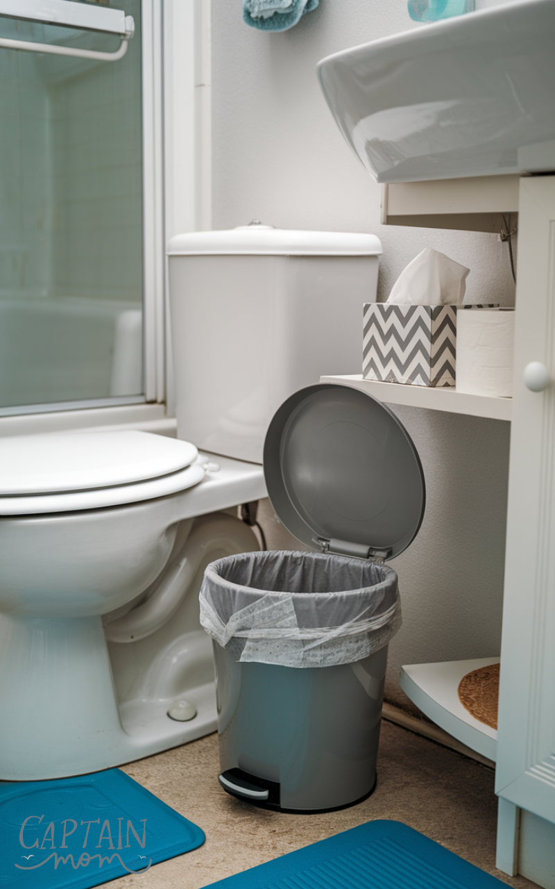 A small trash bin with a liner is essential for keeping the bathroom tidy. Guests can dispose of tissues, wrappers, or other items easily, maintaining a neat and welcoming space. I like to keep the bin discreet yet accessible, and changing the liner before guests arrive always helps the bathroom feel cleaner instantly.