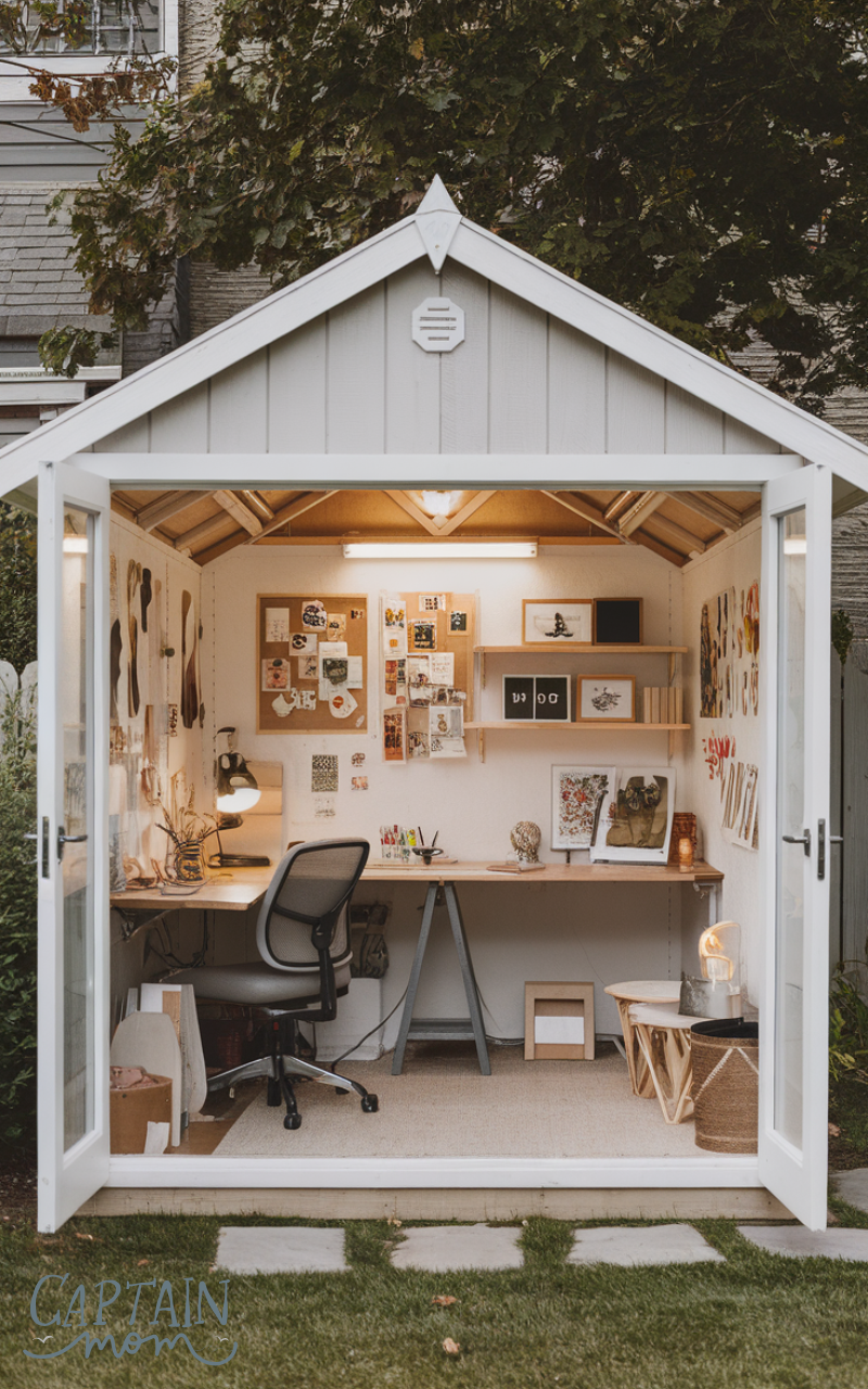 A creative studio shed is perfect for artists, designers, or content creators. These backyard office shed ideas focus on flexible layouts, open space, and inspiring décor. Adding pin boards, shelving, and adjustable lighting supports creative work. This type of shed encourages inspiration while keeping work separate from home life.