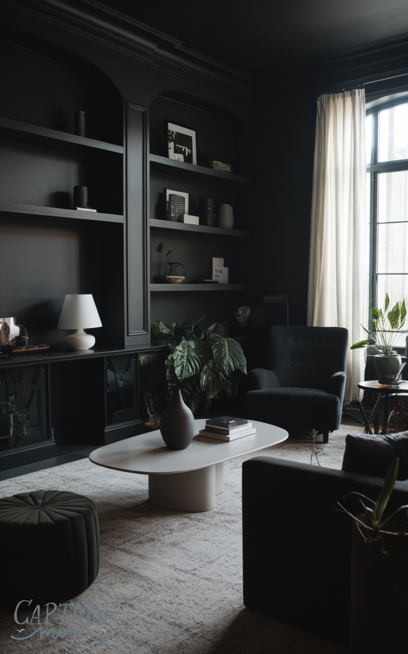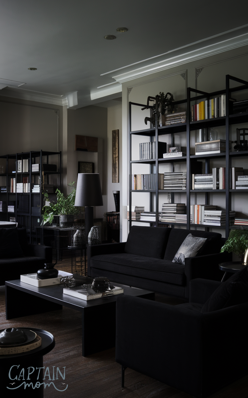 Black furniture is a strong statement in Dark Living Room Decorating Ideas. A black sofa, coffee table, or shelving unit can anchor the space and create a sleek, modern feel. To keep the room from feeling too dark, balance black furniture with lighter walls, textured fabrics, or metallic accents. This contrast adds dimension and keeps the space visually interesting. Black furniture is also practical, timeless, and easy to style.