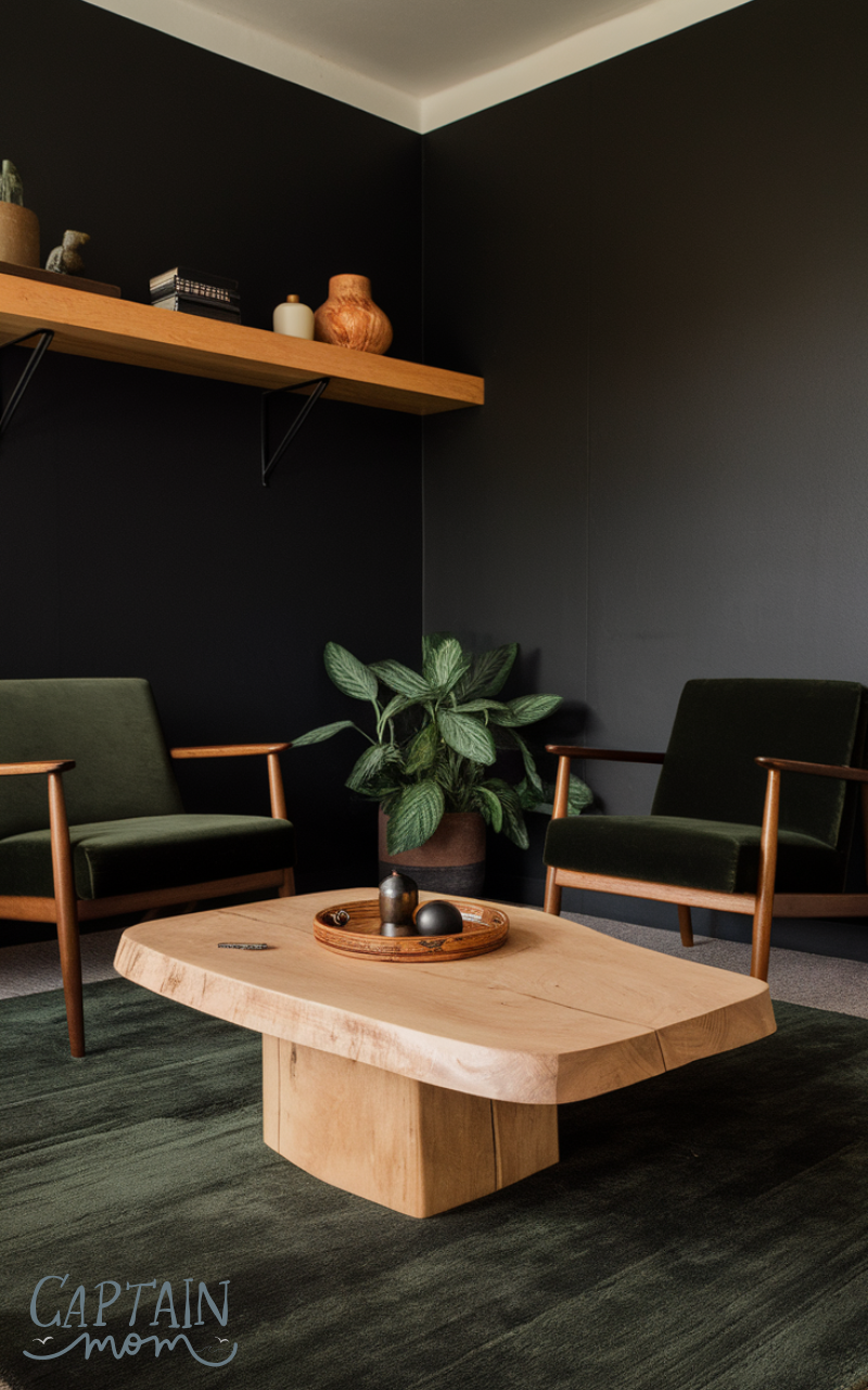 Combining dark walls with natural wood is one of the most balanced Dark Living Room Decorating Ideas. Wood tones add warmth and texture, preventing the room from feeling too heavy. Wooden coffee tables, shelves, or flooring work beautifully against deep colors like black, charcoal, or dark green. This mix creates a grounded, organic feel that’s both modern and timeless. The contrast between dark walls and natural materials makes the space feel cozy, stylish, and well thought out.