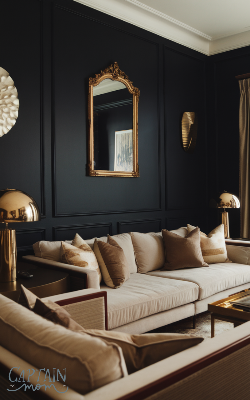 Deep navy is a stunning choice for Dark Living Room Decorating Ideas, especially when paired with gold or brass accents. The richness of navy adds drama, while metallic touches bring elegance and brightness. Think gold-framed mirrors, brass lamps, or metallic decor pieces. This contrast enhances the luxurious feel of the space without making it feel cold. Navy walls also work beautifully with neutral sofas and warm wood tones. The result is a balanced living room that feels sophisticated, cozy, and perfect for relaxing or entertaining guests.