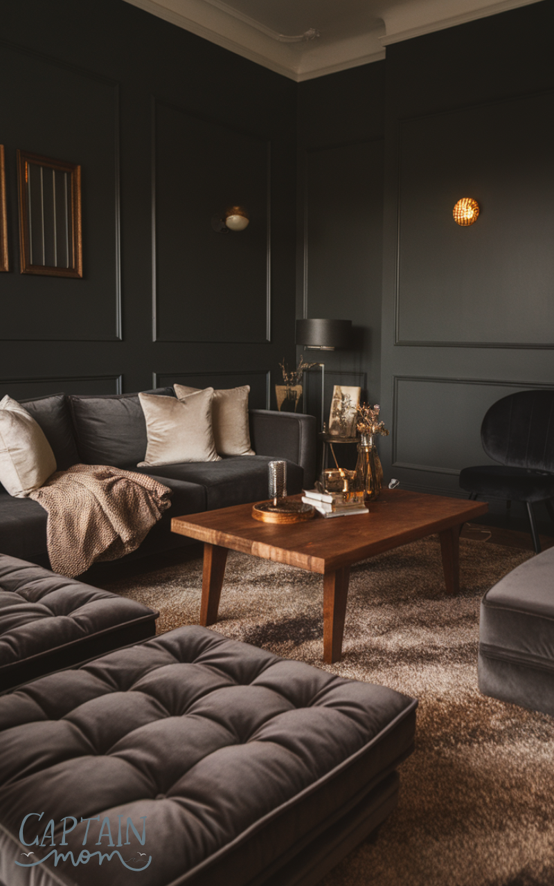 Charcoal gray walls are a timeless foundation for Dark Living Room Decorating Ideas because they add depth without overwhelming the space. Pair these walls with soft textures like plush rugs, velvet cushions, and cozy throws to balance the darkness. This combination keeps the room feeling warm and welcoming while still stylish. Adding light-colored accents, such as cream pillows or wooden furniture, creates contrast and prevents the room from feeling flat. Charcoal gray works well with both modern and classic interiors, making it a versatile choice for anyone wanting a refined dark living room look.
