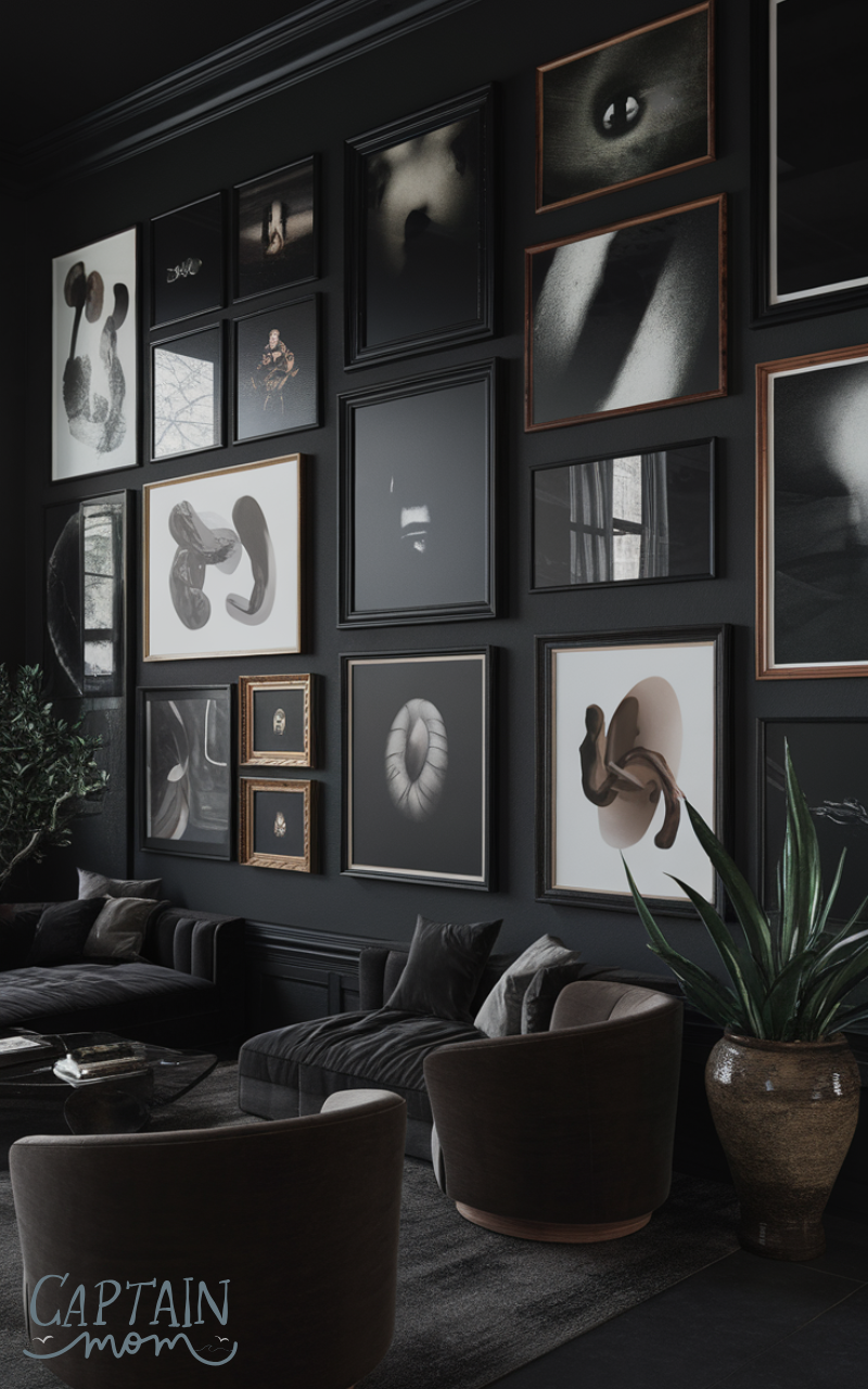 Art plays a huge role in Dark Living Room Decorating Ideas. Choose moody artwork with deep colors, abstract designs, or dramatic photography. A gallery wall against a dark background looks striking and personal. Frames in black, gold, or wood tones enhance the overall look. Art helps break up dark walls and adds emotion and storytelling to your space, making it feel lived-in and expressive.