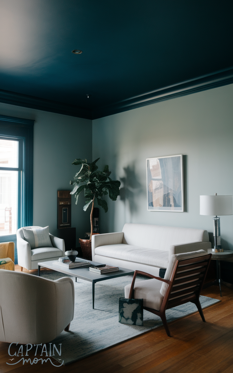 Painting the ceiling a dark color is an unexpected yet powerful Dark Living Room Decorating Idea. It creates a cocoon-like effect that makes the room feel cozy and intimate. This works best in rooms with standard or high ceilings. Pair a dark ceiling with lighter floors or furniture to maintain balance. This design choice adds character and makes the living room feel unique and thoughtfully designed.