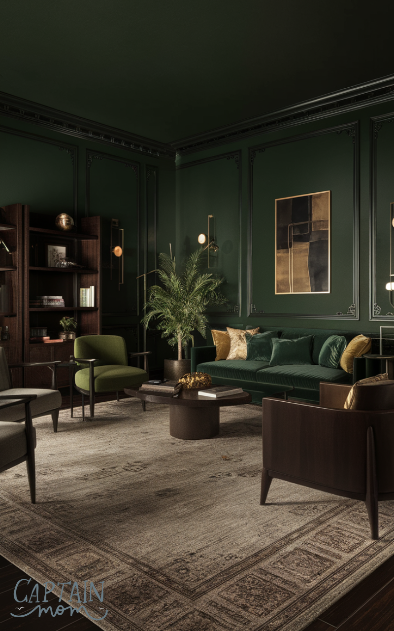 Emerald green is a rich and elegant color that fits perfectly into Dark Living Room Decorating Ideas. It adds color without losing the moody vibe. Pair emerald walls with gold accents, dark wood furniture, or neutral textiles for balance. This color reflects light beautifully, making the room feel vibrant yet calm. Emerald green works especially well in living rooms with good natural light, creating a luxurious atmosphere that feels both bold and comfortable.