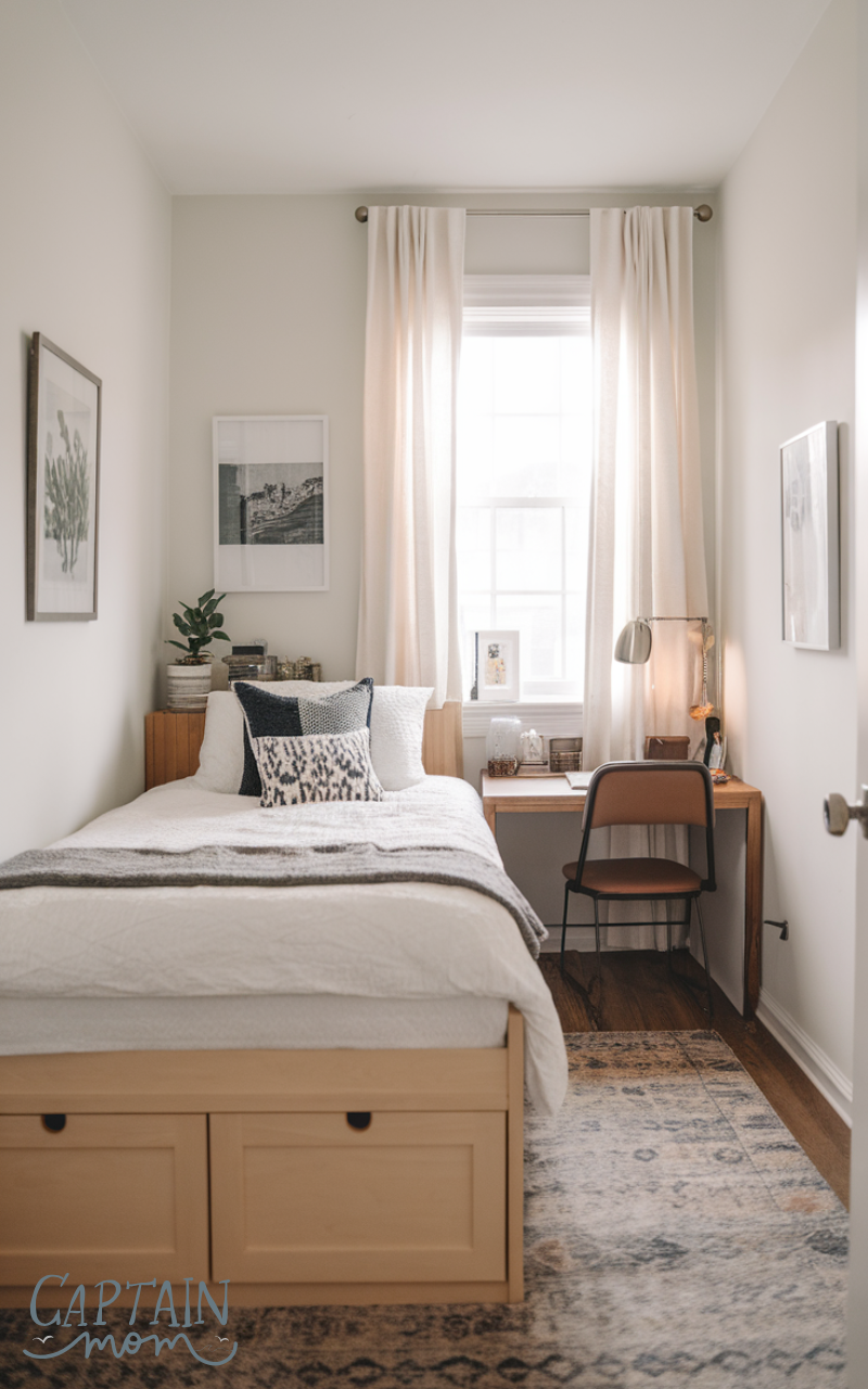 A storage bed frame is among the most effective layout tips for a tiny bedroom with a queen bed because it eliminates the need for extra furniture. Drawers underneath the bed can store clothes, linens, or seasonal items, keeping clutter off the floor. This makes the room feel cleaner, calmer, and more spacious. Choosing a low-profile storage bed also prevents the space from feeling top-heavy. Pair it with minimal décor and light bedding to maintain a bright, open look.