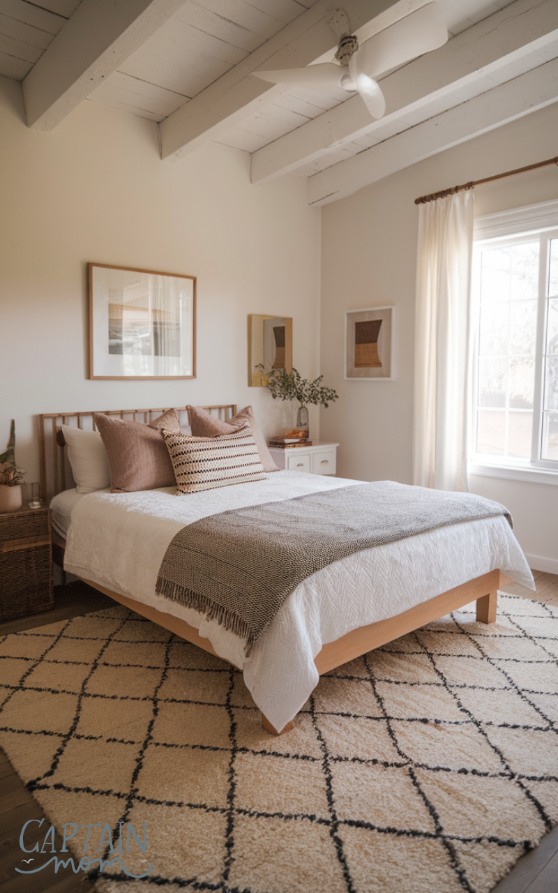 A well-placed rug is one of the cozy layout tips for a tiny bedroom with a queen bed. A rug that extends beyond the bed creates a sense of structure and makes the room feel larger. Light-colored rugs brighten the space, while soft textures add warmth and comfort. Make sure it aligns symmetrically with the bed for a polished look.