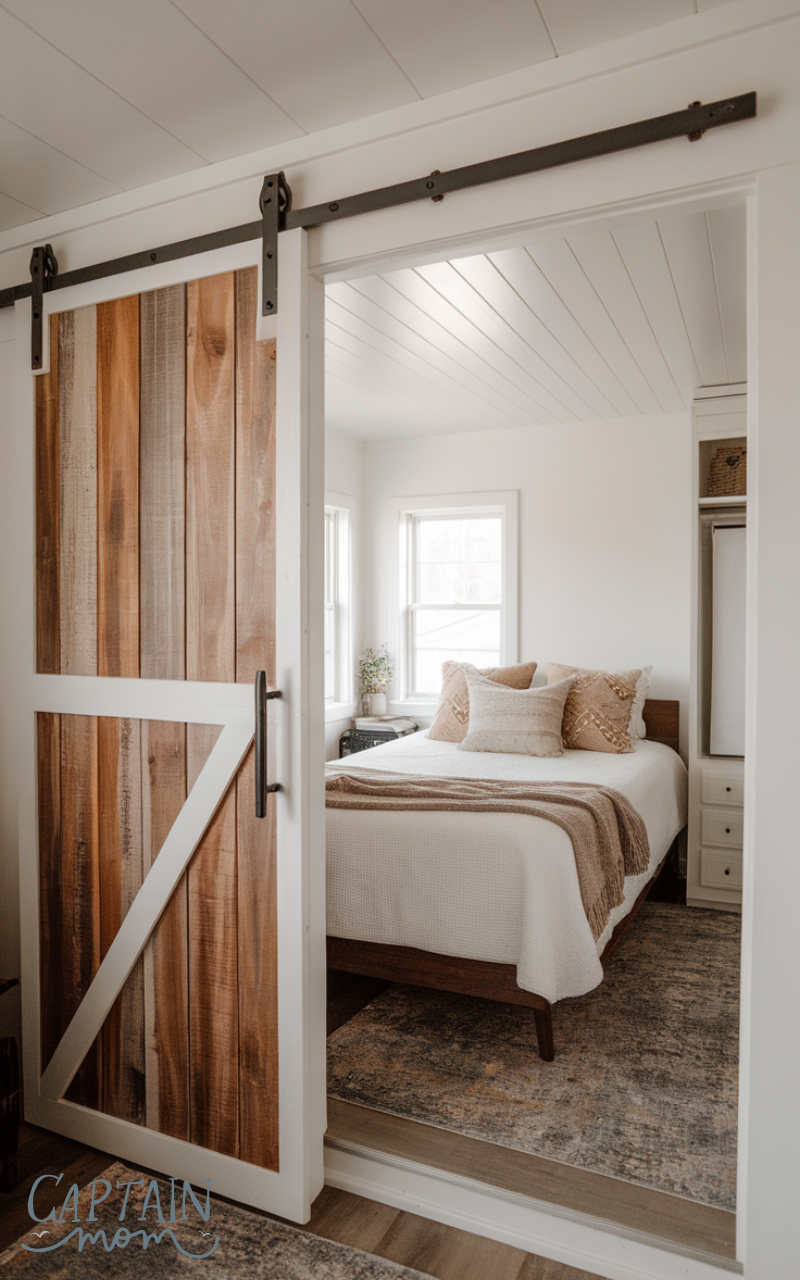Sliding doors are excellent layout tips for a tiny bedroom with a queen bed because they save swing space that traditional doors need. This allows for better furniture placement and smoother movement in the room. Sliding barn doors or pocket doors are stylish and functional choices that enhance both space and design.