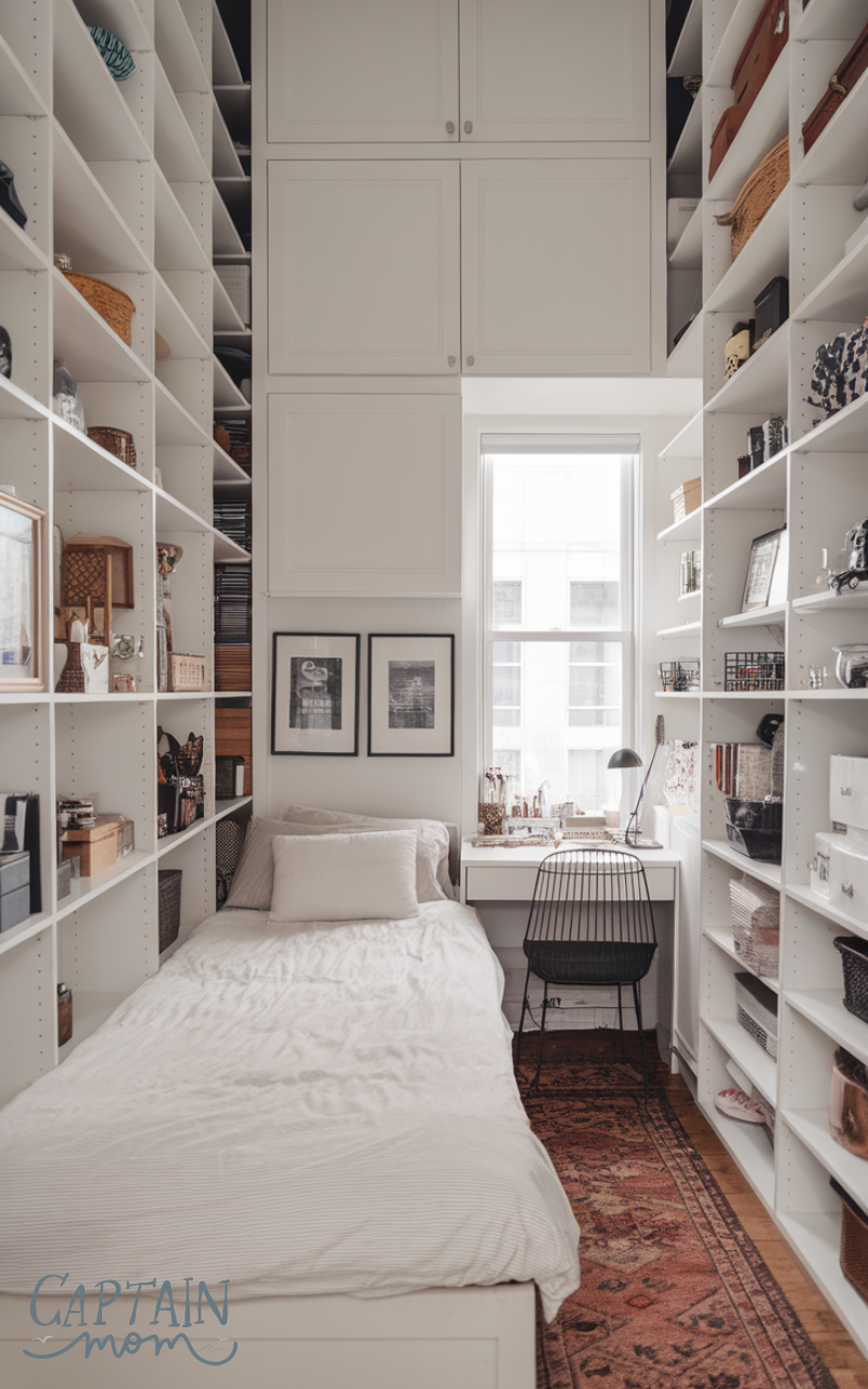 Using vertical storage is one of the best layout tips for a tiny bedroom with a queen bed because it maximizes space upward rather than outward. Tall shelves, wall cabinets, or floating units keep items organized without crowding the floor. This approach keeps the room functional while maintaining an open layout. Sticking to matching colors prevents visual chaos and maintains harmony.